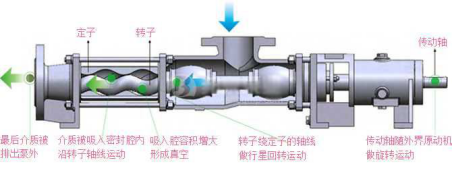 G系列料斗式螺桿泵是容積式轉子泵,主要工作部件是偏心螺桿(轉子)和固定的襯套(定子)。由于定子和轉子的幾何形狀,分別形成單獨的密封容腔,介質由軸向均勻推行流動,內部流速低,容積保持不變,壓力穩定,因而不會產生渦流和攪動。